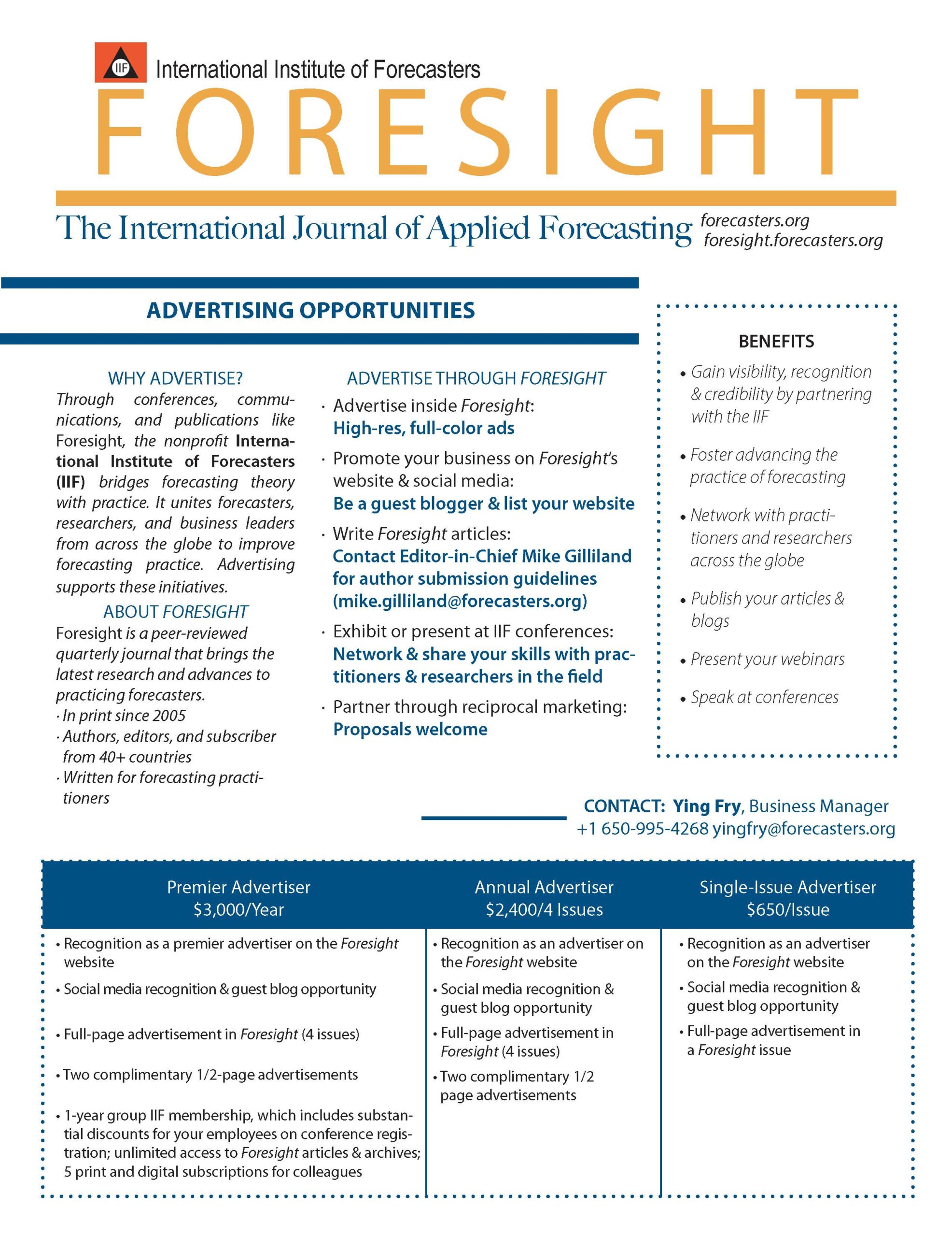 Our mission — to improve the practice of forecasting and the performance of forecasters — means Foresight is a must-read for your target audience. When you promote your products and services in Foresight, your message gets through to forecasters — from analysts to VPs — in companies large and small, worldwide.